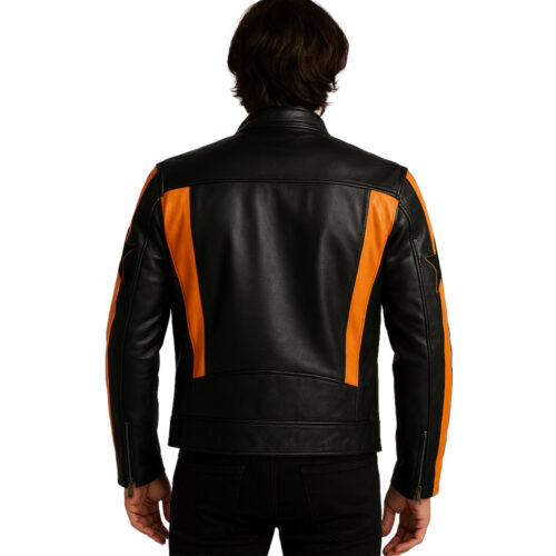 Men’s Black & Orange Racer Star Biker Leather Jacket