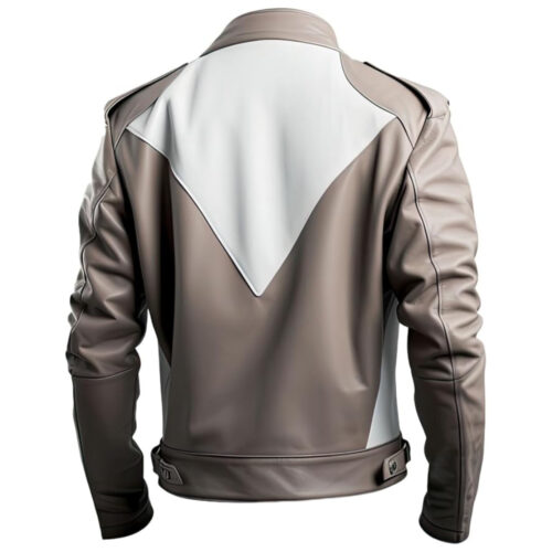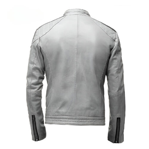 Men’s White Ash Grey Moto Leather Jacket – Stand Collar, Slim-Fit