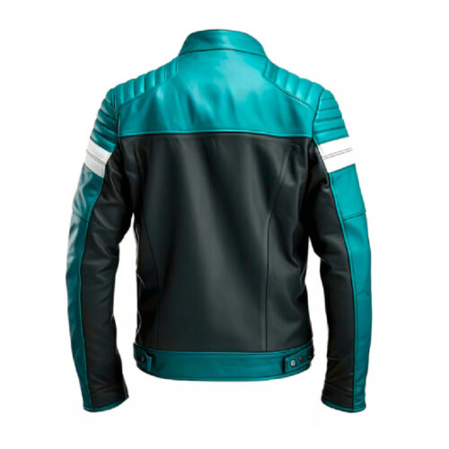 Men’s Teal & Black Sheepskin Biker Leather Jacket – Racing Stripe Moto Style