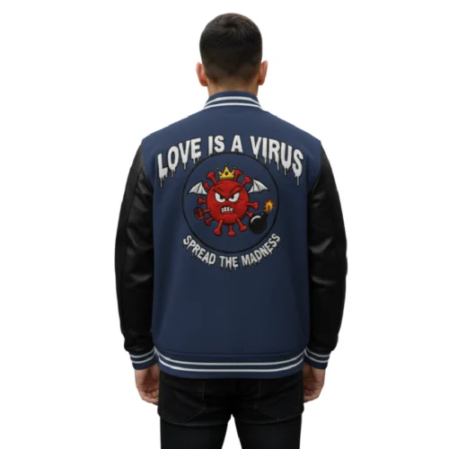 Men’s “Love Is A Virus” Navy Blue Varsity Leather Bomber Jacket