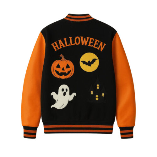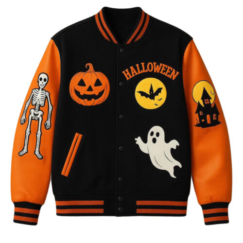 Men’s Halloween Varsity Baseball Bomber Jacket – Ghost, Pumpkin & Bat Design