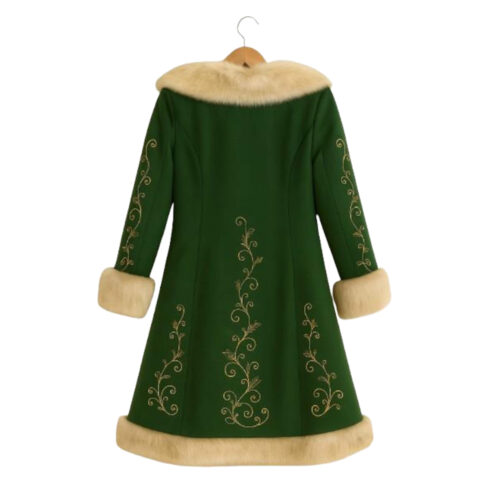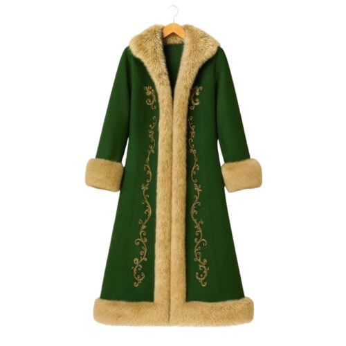 Men’s Green Christmas Fur Trim Embroidered Long Coat