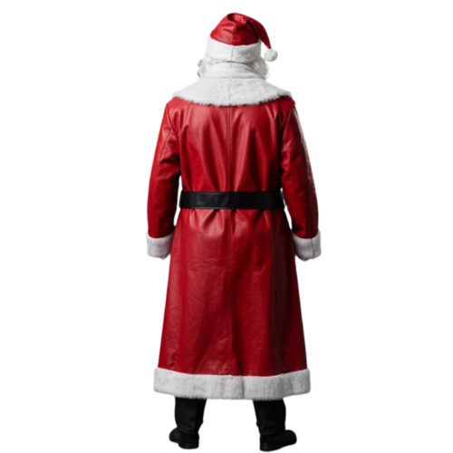 Men’s Classic Santa Christmas Red Leather Long Coat – White Fur Trim