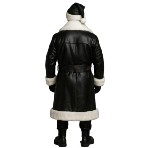 Men’s Black Santa Christmas Leather Long Coat White Shearling Trim & Belted Design