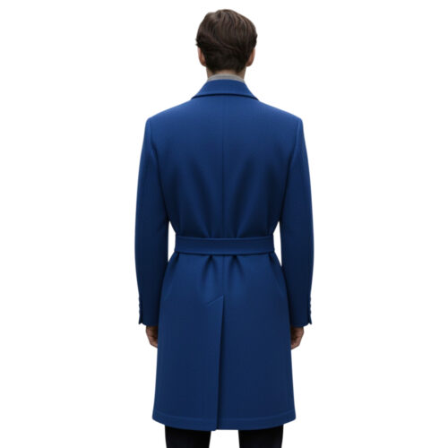Men’s Royal Blue Double-Breasted Wool Overcoat With Belted