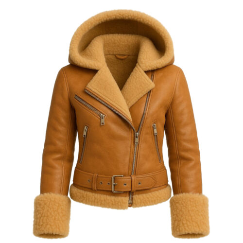 Women’s Camel Faux Shearling-Lined Hooded Moto Jacket