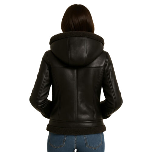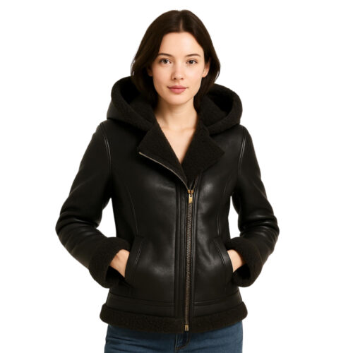 Women’s Black Faux Shearling-Lined Hooded Aviator Moto Jacket