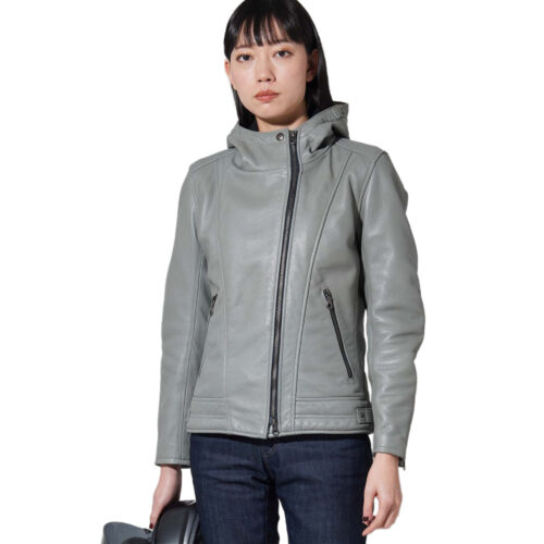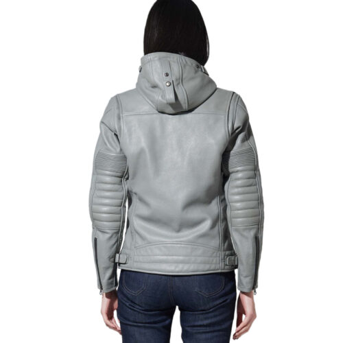 Women’s Light Grey Hooded Leather Motorcycle Jacket – Urban Rebel Edition
