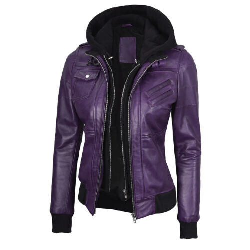 Women’s Purple Faux Leather Hooded Bomber Moto Jacket