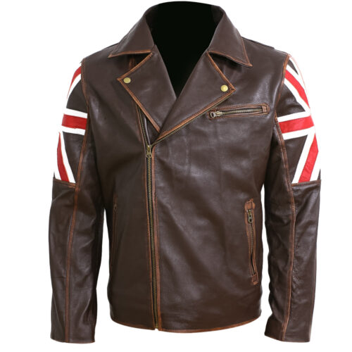 Men’s Brown Union Jack Leather Biker Jacket – Vintage Motorcycle Style $235.00 Original price was: $235.00.$177.20Current price is: $177.20.