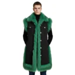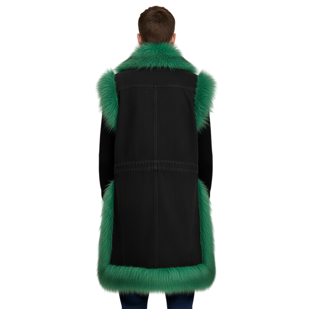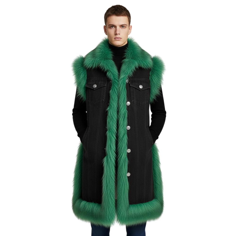 Elevate your outerwear game with this black denim long vest jacket, featuring a striking emerald green faux fur collar and hem trim. Its oversized, duster-length design combines classic denim durability with luxurious fur accents, creating a bold, fashion-forward piece. Perfect for layering over casual or streetwear outfits, this vest jacket blends comfort, style, and statement-making details in one versatile coat.
