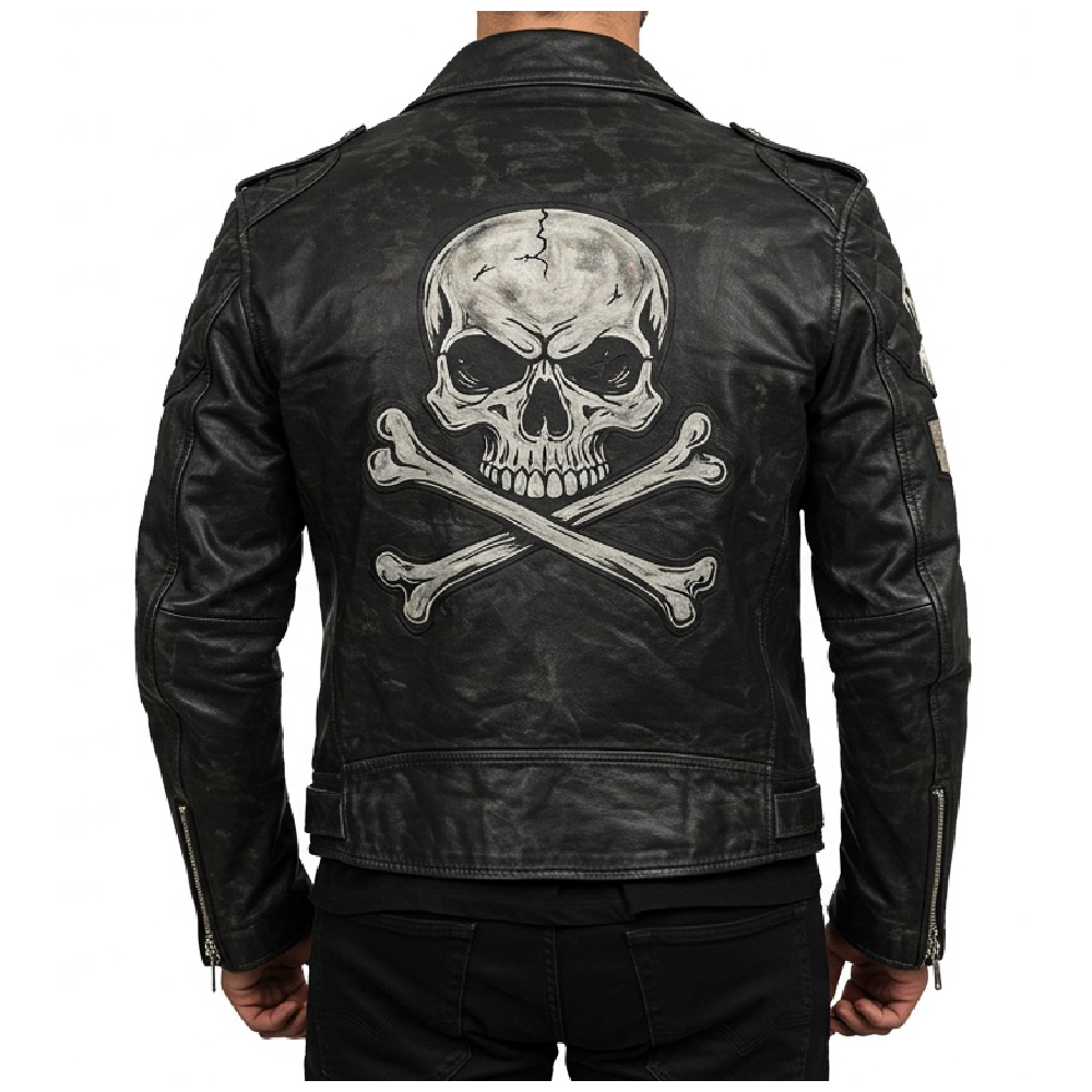 Featuring a striking skull and crossbones motif, it embodies fearless attitude and road-ready confidence. The sleek black finish, detailed stitching, and timeless moto silhouette make it a standout piece for any wardrobe.