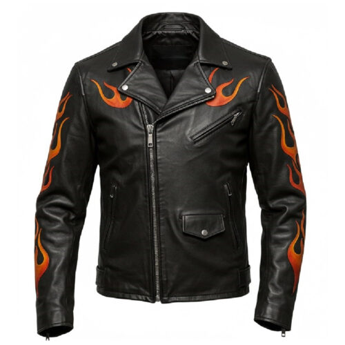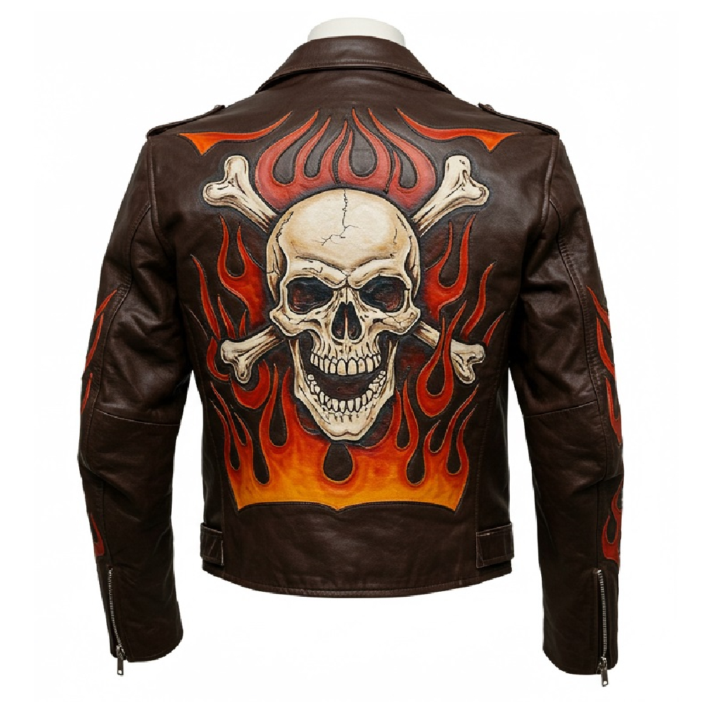 Ride in style with this Flame Skull Biker Jacket, where fearless design meets genuine craftsmanship.