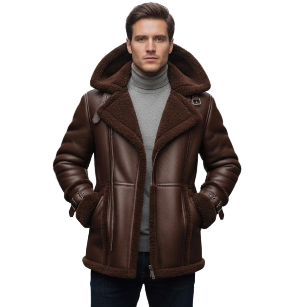 Men’s Dark Chocolate Shearling Biker Aviator With Hood – Frostbite Renegade