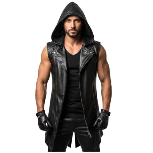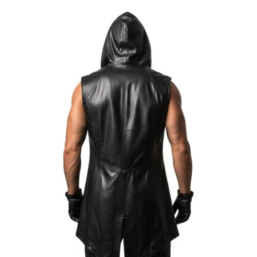 Men’s Black Leather Sleeveless Assassin Hoodie – Shadow Reaper Long Vest