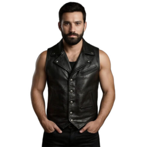 Men's Classic Black Leather Biker Vest – Outlaw Cut $230.00 Original price was: $230.00.$170.00Current price is: $170.00.