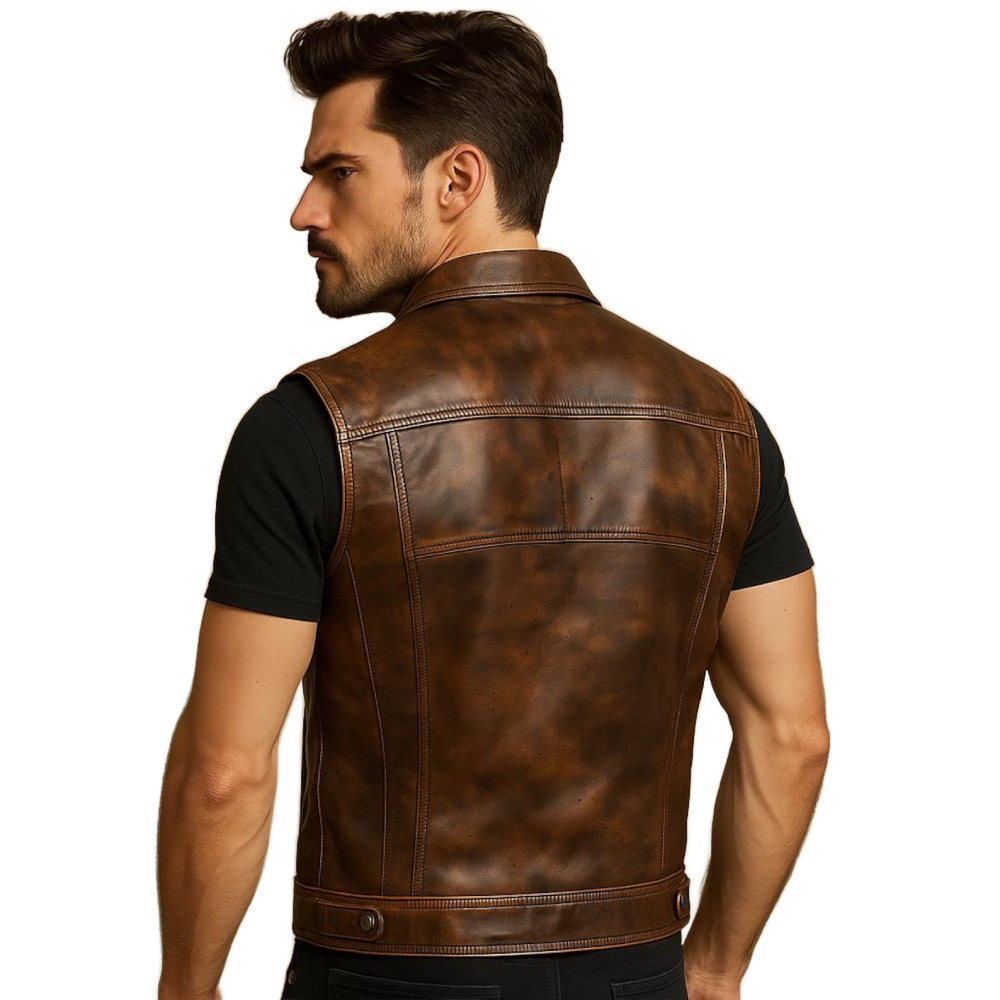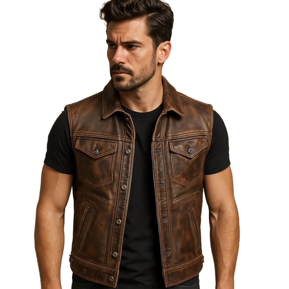 This distressed brown leather moto vest channels decades of open-road rebellion and old-school biker toughness. Hand-crafted from premium full-grain cowhide with a heavy vintage wash, it carries an authentic worn-in patina—like it’s survived a thousand sunsets, highways, and bar fights. Designed with classic trucker elements, it features a pointed collar, dual chest flap pockets, antique silver snaps, hidden front zipper, and side cinch tabs for a customizable fit. Tough, timeless, and full of character, it’s the vest of a true road warrior.