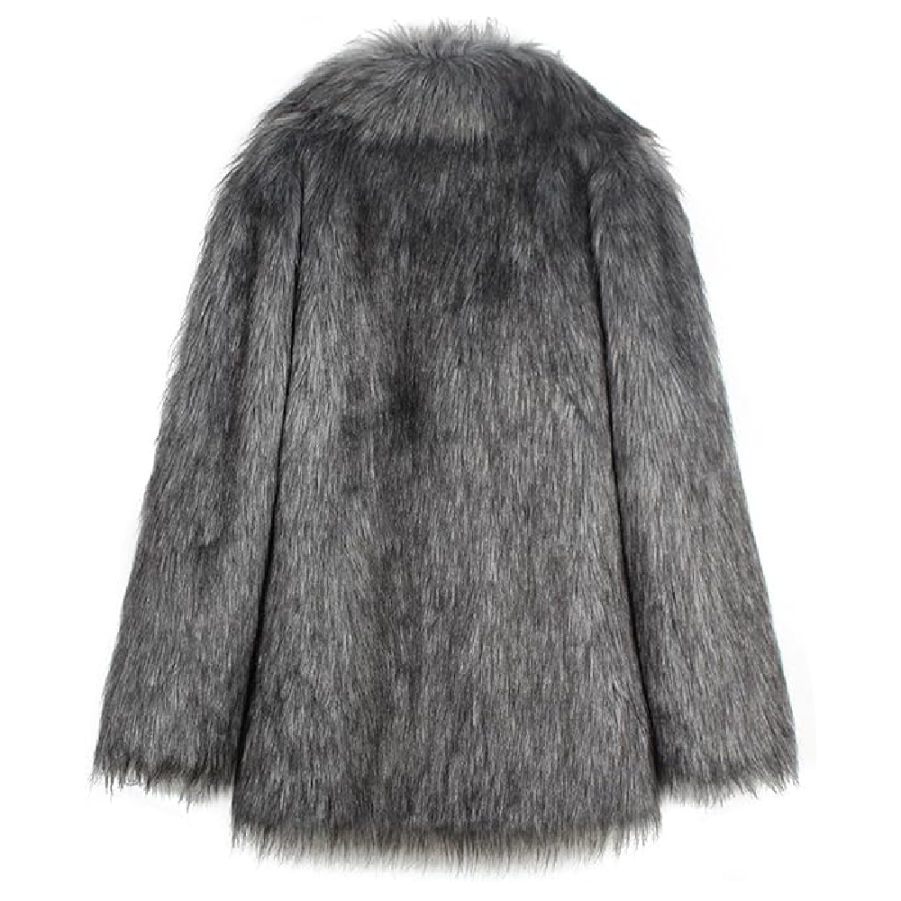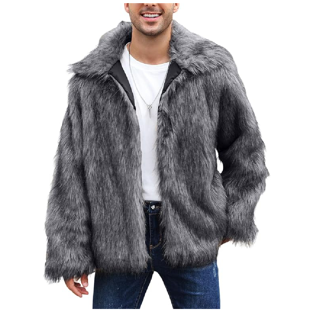 Men’s Faux Fur Jacket – Fluffy Furry Collar Long Sleeve Warm Cardigan Grey