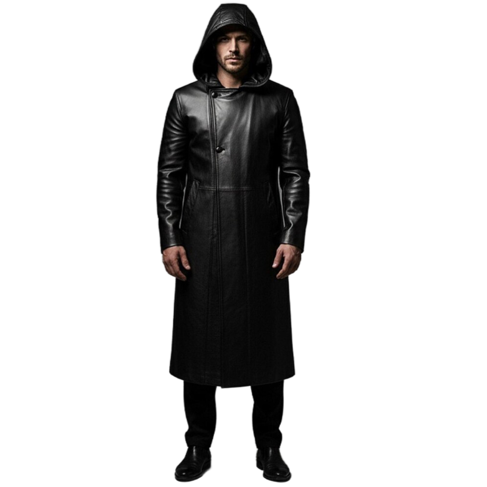 Men’s Full-Length Black Leather Executioner Coat With Hood – Void Sovereign
