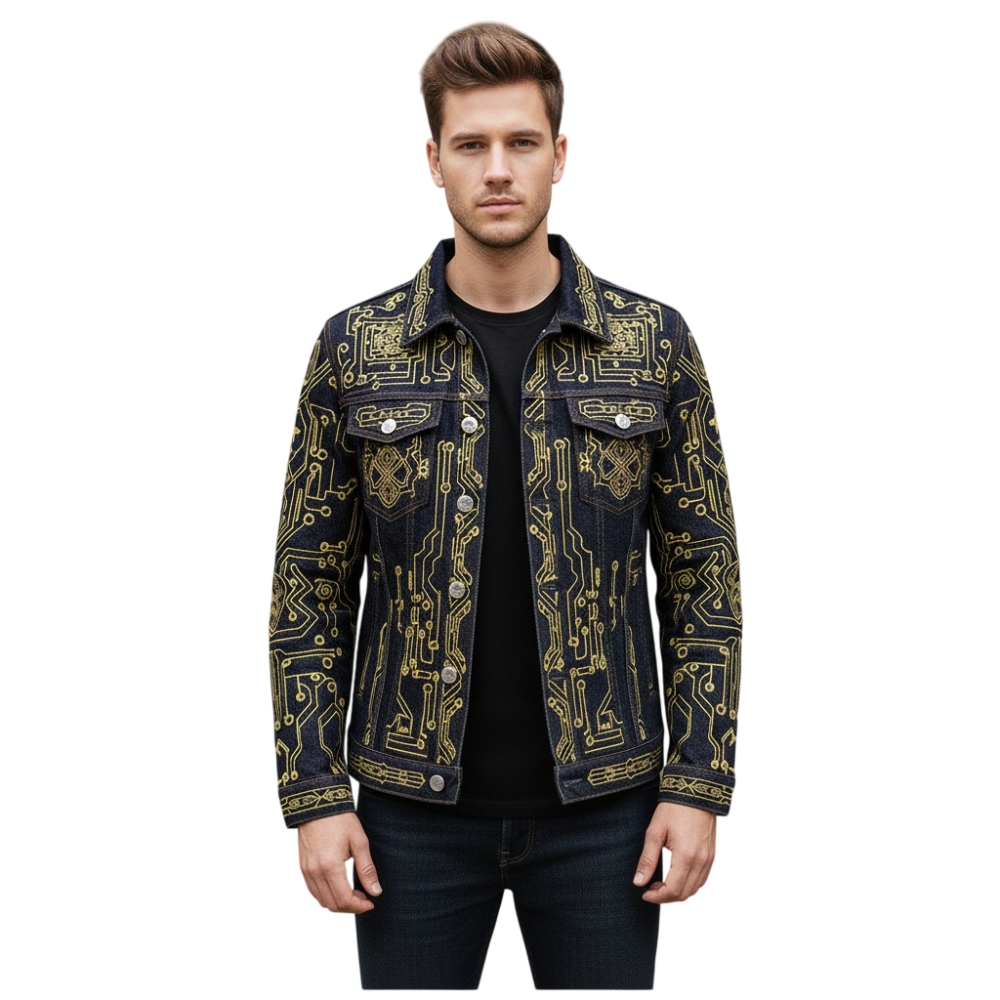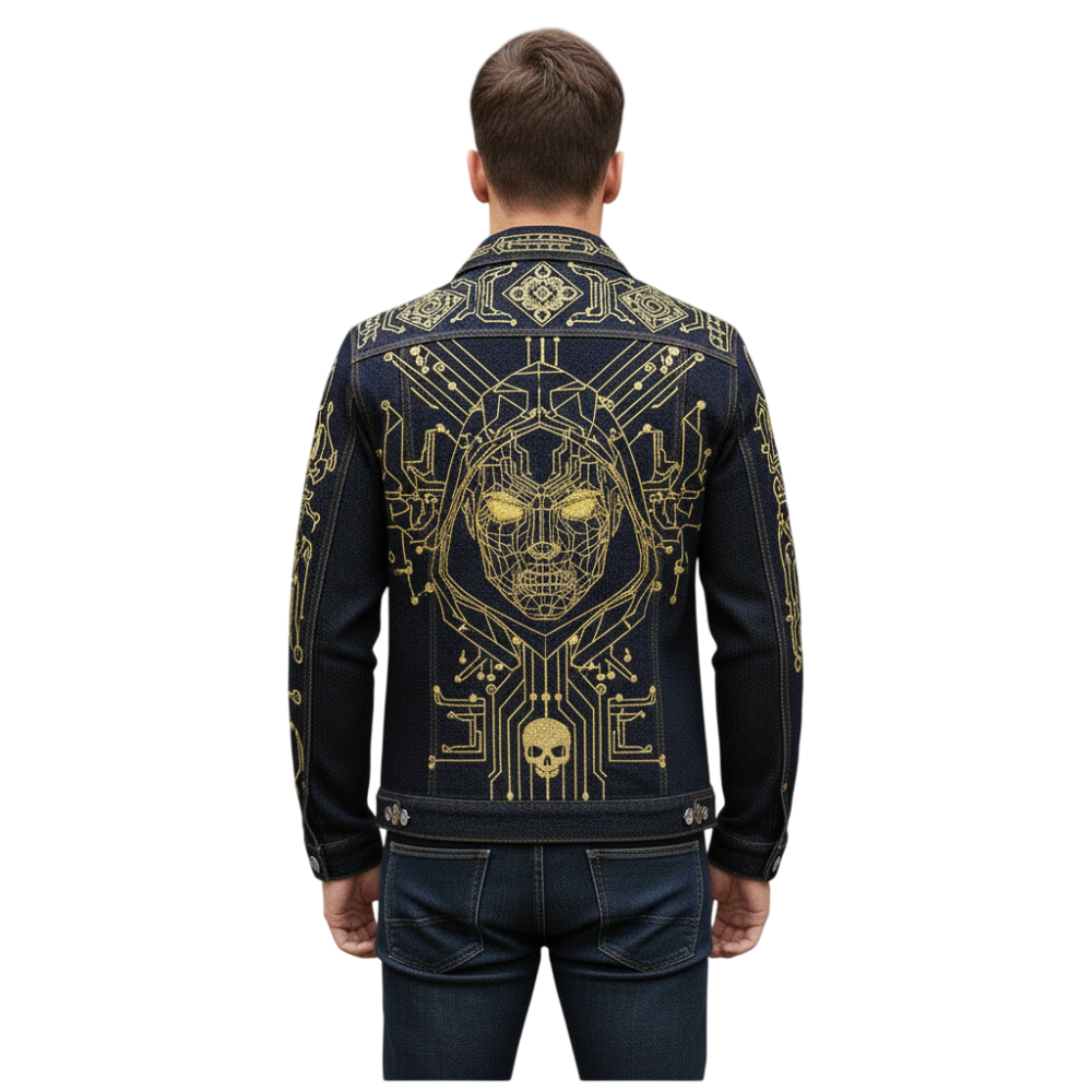 Command attention with this Men’s Gold Cyber Skull Embroidered Black Denim Jacket, a striking fusion of futuristic tech aesthetics and modern streetwear. Designed in deep black denim, the jacket features a powerful gold cyber skull embroidery enhanced with circuit-board detailing, creating a high-impact neon-tech look. Precision embroidery across the body and sleeves delivers a sharp, edgy silhouette that feels bold, modern, and unapologetically statement-making.