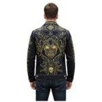 - Intricate gold cyber skull embroidery with circuit-board detailing