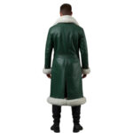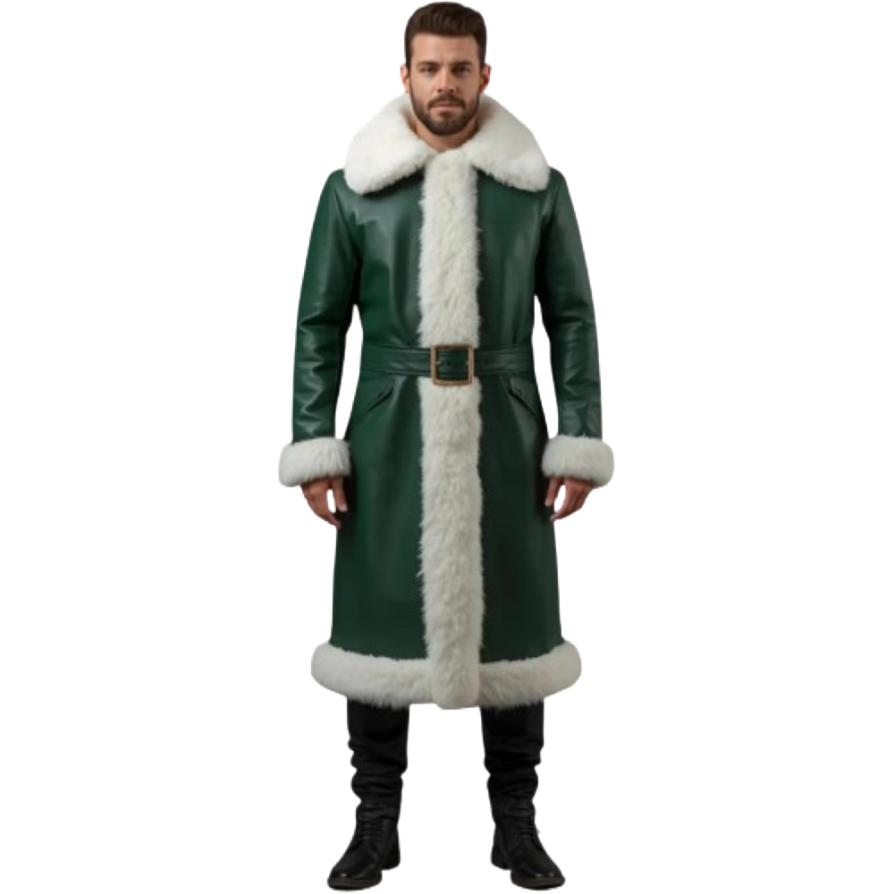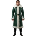 Men’s Green Santa Christmas Leather Long Coat – White Shearling Trim