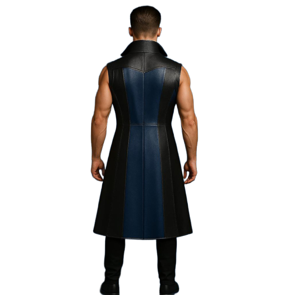 Command attention with the Midnight Blue & Black Matrix Trench Vest. Crafted from butter-soft premium lambskin, this floor-length sleeveless vest features striking midnight-blue center panels against a jet-black backdrop. A wide notched lapel, matte-black buttons, and a sculpted waistline create a sleek, cyber-goth silhouette that flares into a dramatic cascade. Perfect for showcasing strength, style, and shadow-forged attitude.