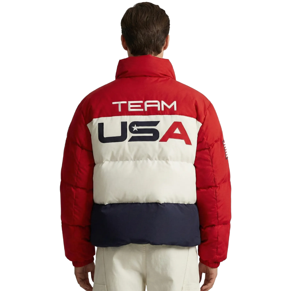 Embrace bold winter style with the Men’s Olympic Winter Games Puffer Jacket in Red, White, and Navy. Designed with a dynamic color-block pattern inspired by international winter sports energy, this jacket delivers both performance-driven warmth and standout athletic appeal.