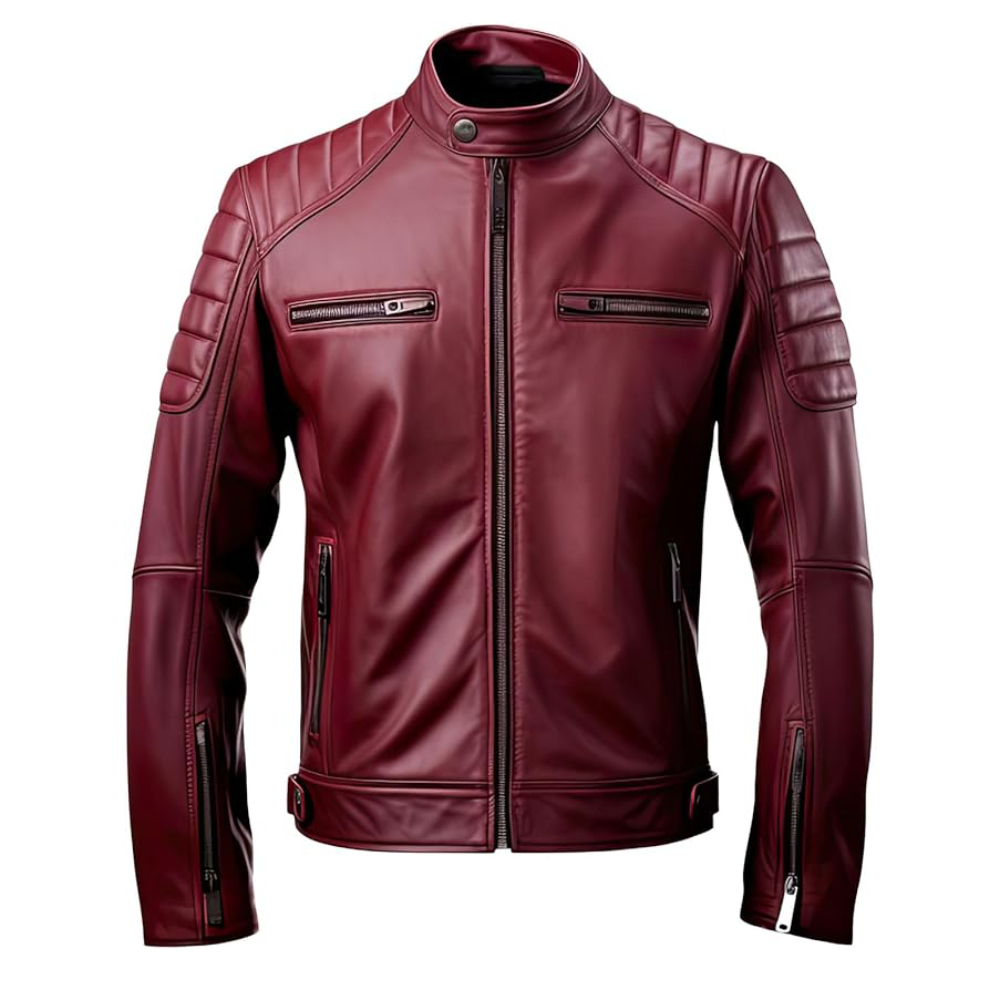 Elevate your wardrobe with the Men’s Real Lambskin Stand Collar Zip-Up Biker Maroon Leather Jacket – the ultimate blend of bold fashion, comfort, and durability!