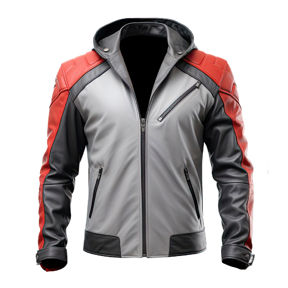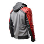 Men’s Red & Grey Sporty Soft Biker Leather Hooded Jacket