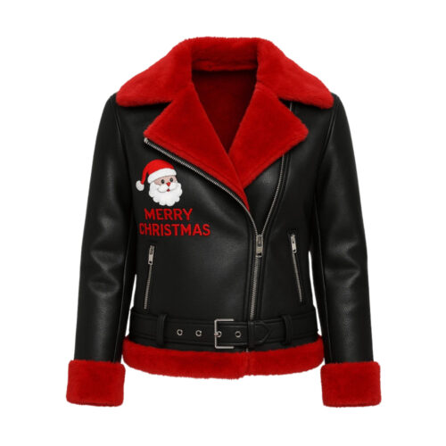 The front showcases a Merry Christmas embroidery alongside a smiling Santa patch, adding a fun, celebratory vibe to the classic biker silhouette. With a belted waist, asymmetrical zipper, and zippered side pockets, this jacket keeps the timeless moto look alive while embracing the joy of the season.