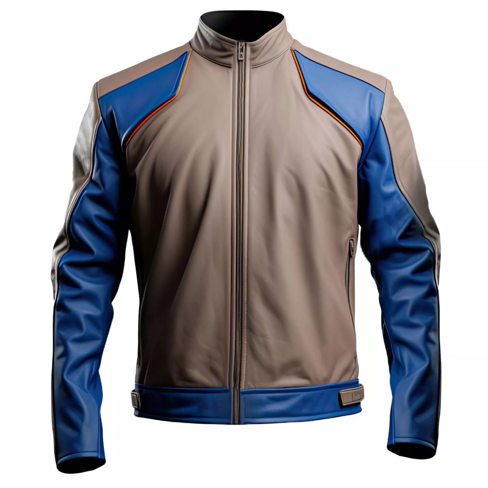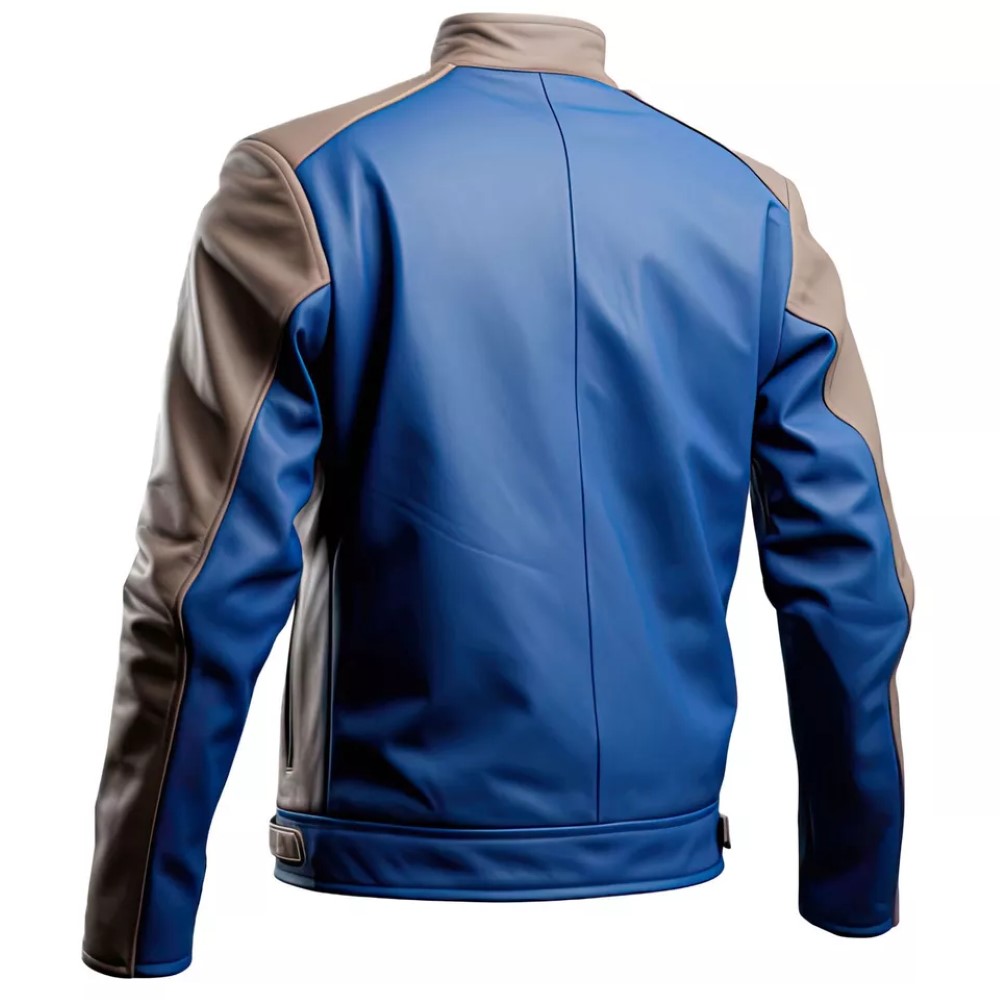 Men’s Sand Grey & Royal Blue Genuine Sheepskin Biker Leather Jacket