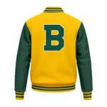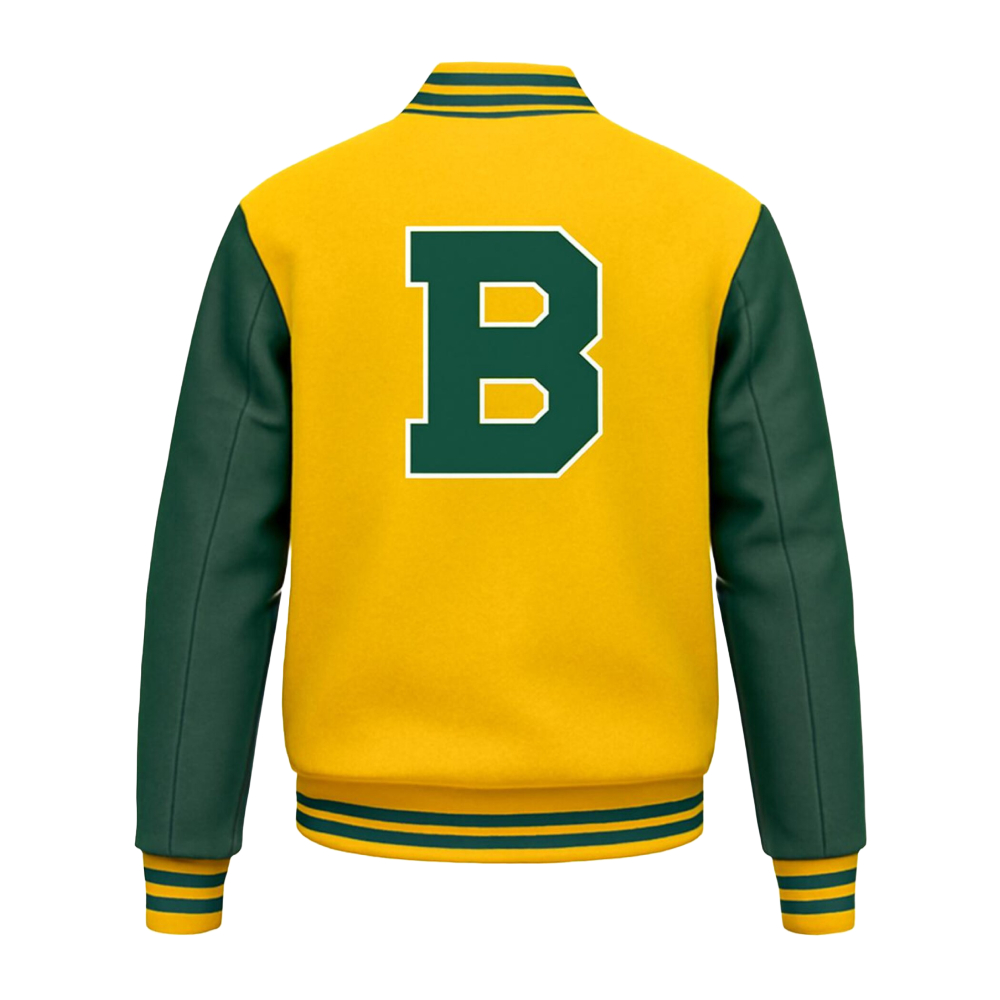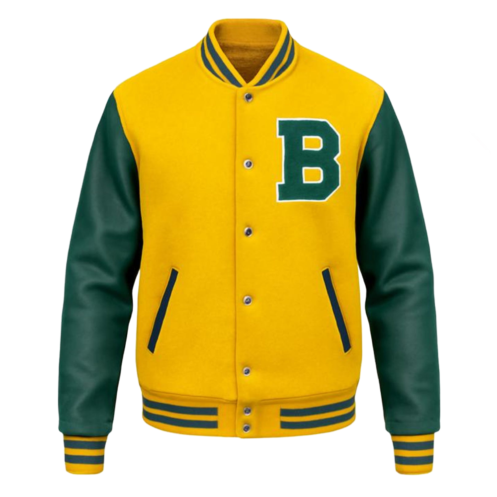 Men’s Yellow & Green Varsity Letterman Baseball Leather Jacket With “B” Patch