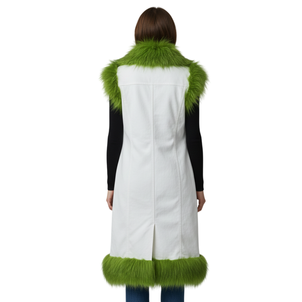 Elevate your wardrobe with this Women’s Green & White Denim Long Vest Jacket, featuring luxurious fox fur trim for a bold, fashion-forward statement. Designed to combine edgy street style with cozy sophistication, this vest is perfect for layering over casual outfits or dressing up your evening look. Its longline silhouette adds elegance while keeping you warm and stylish during cooler days.