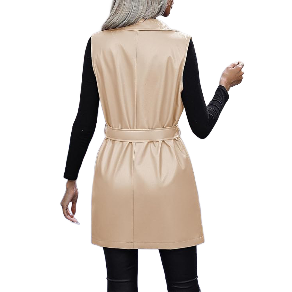 Women’s Beige Faux Leather Sleeveless Trench Vest With Belt