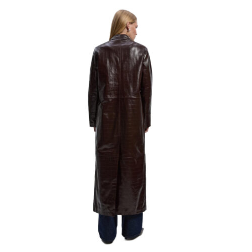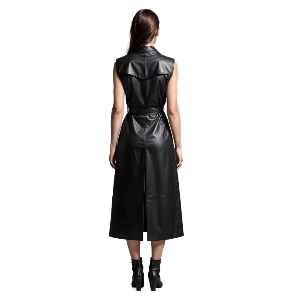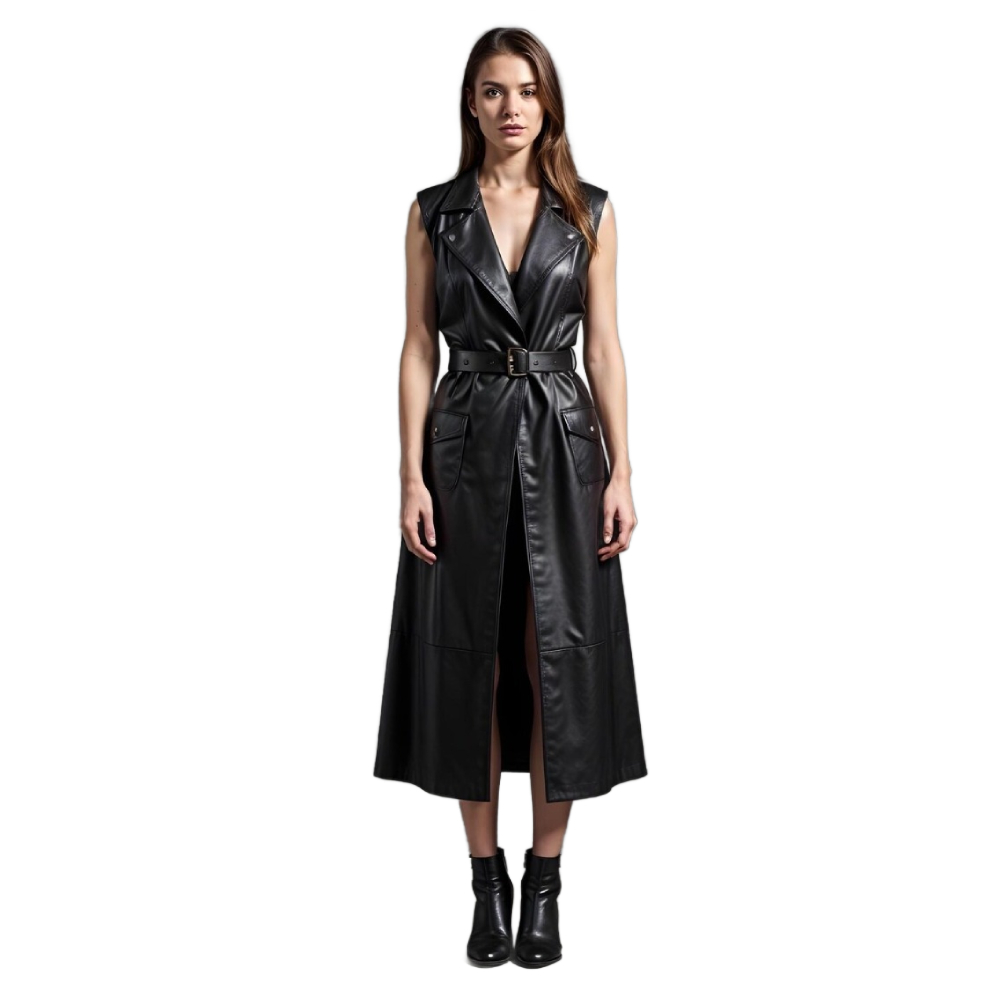 Command attention with this sleek, edgy black faux leather sleeveless maxi trench coat. Designed with a flowing longline silhouette, this coat adds drama and sophistication to any outfit. The sleeveless design allows for easy layering over dresses, tops, or knitwear, while the matching belt cinches the waist to create a flattering, tailored fit. Crafted from high-quality faux leather, it offers a polished, leather-look finish without compromising on comfort or ethics. Perfect for women who love bold, fashion-forward outerwear that makes a statement.