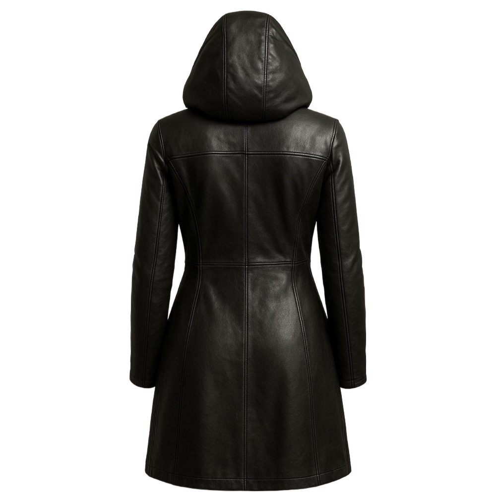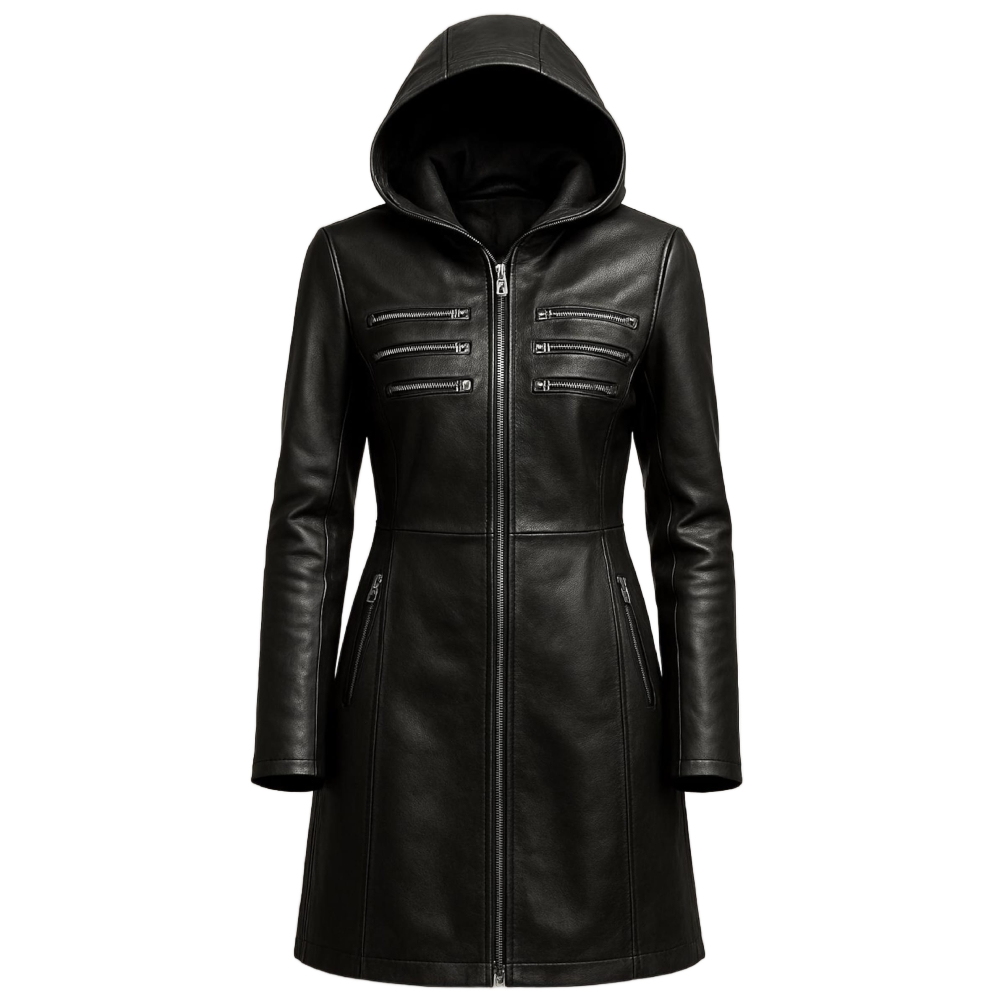 Women’s Black Hooded Faux Leather Longline Moto Coat