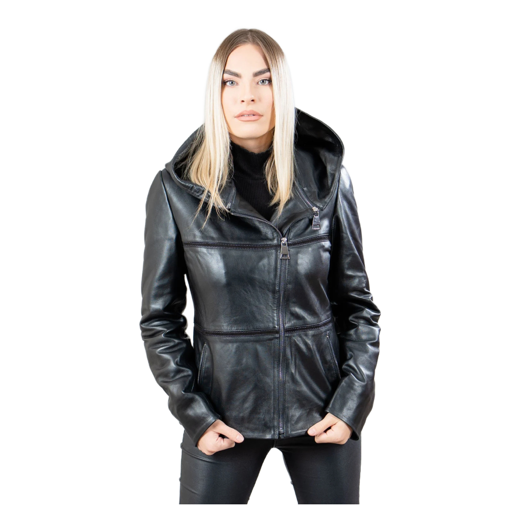 Women’s Black Lambskin Leather Jacket With Detachable Hooded & Collar – Versatile & Stylish