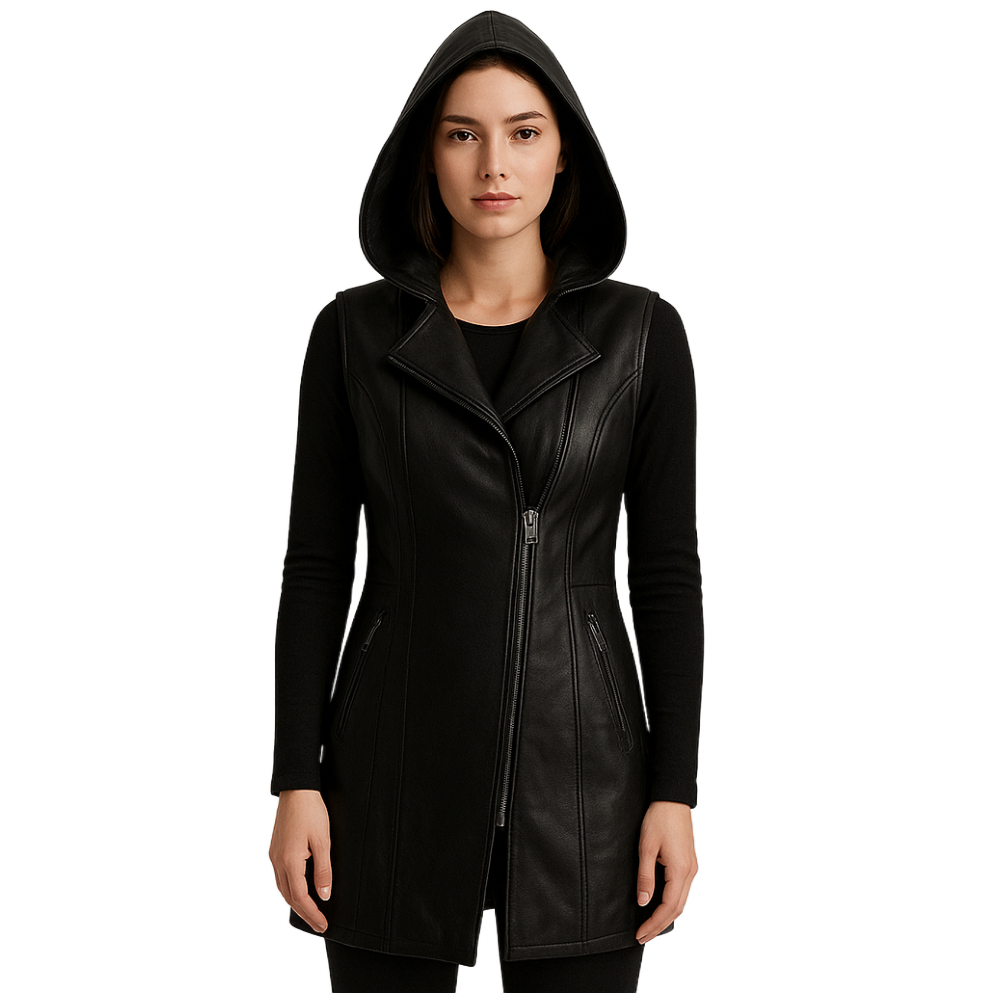 This black leather hooded moto vest fuses the fierce attitude of a biker jacket with the shadowy elegance of an assassin-inspired cloak. Crafted from buttery-soft premium lambskin leather, it features an asymmetrical heavy-duty zipper, sculpted princess seams for a sharp, contoured fit, and zippered hand pockets for utility and edge. The oversized hood drapes flawlessly whether worn up or down, adding instant drama to your look. With its elongated mid-thigh length, this vest creates a striking urban-ninja silhouette — bold, cinematic, and impossible to ignore.
