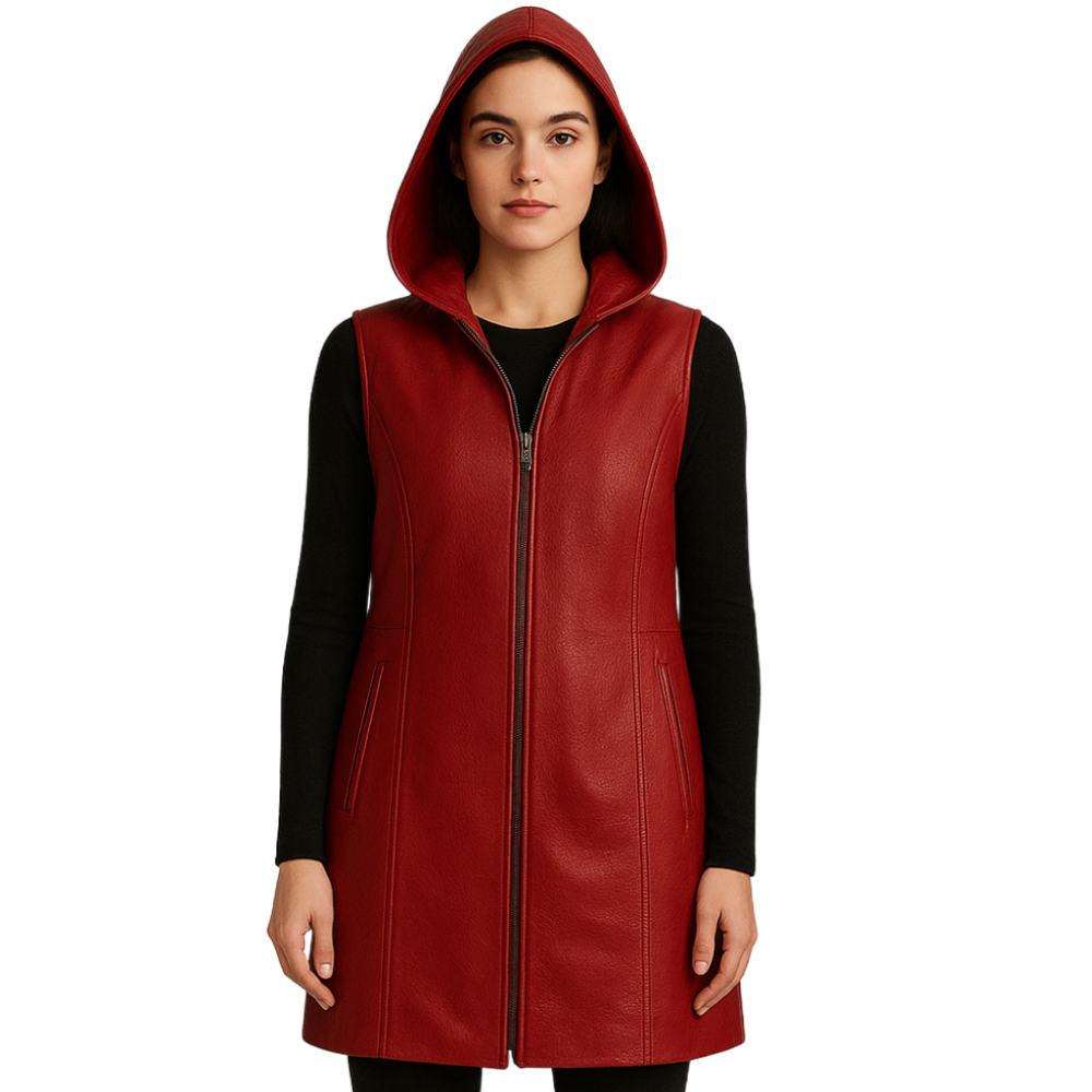 This blood-red leather hooded long vest reimagines the iconic fairy-tale cape as a fierce, modern statement piece. Crafted from luxurious pebbled lambskin leather in a deep, saturated crimson, it radiates bold confidence and dark elegance. The dramatic oversized hood adds mystery and flow, while the full front zipper and sculpted princess seams create a sleek, body-hugging silhouette. Slant zip pockets deliver practicality with attitude, and the elongated mid-thigh length moves with liquid fluidity, giving your walk a powerful, unforgettable presence.