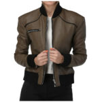 Women’s Brown Bomber Leather Jacket – Classic Short Fit With Black Ribbed Trim