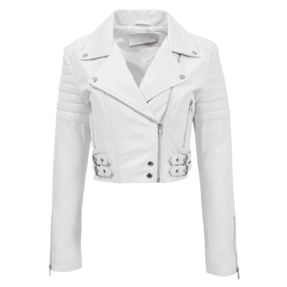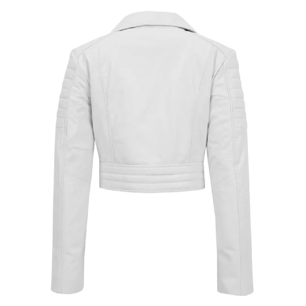 Women’s Cropped White Biker Short Leather Jacket – 100% Real Lambskin