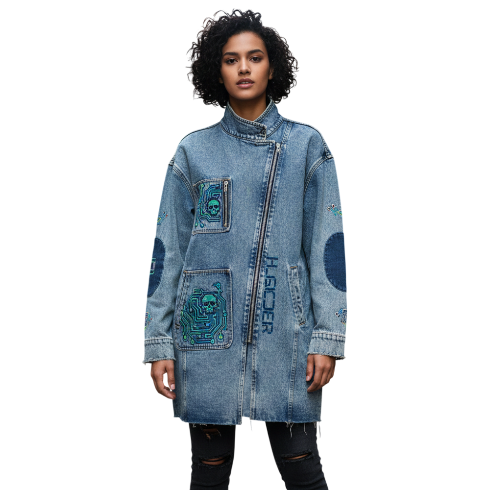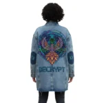 Enter the future of streetwear with the Women’s Decrypt Phoenix Neon Hacker Denim Duster Coat. This oversized denim coat, part of the Hacker Series, blends cyberpunk aesthetics with bold design, featuring neon embroidery inspired by digital circuitry and a striking phoenix motif on the back. The long duster silhouette creates a dramatic, flowing look while maintaining comfort and wearability. Perfect for those who want to make a statement with futuristic, edgy fashion that merges technology and art.