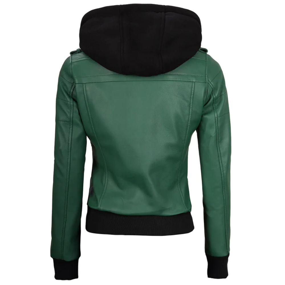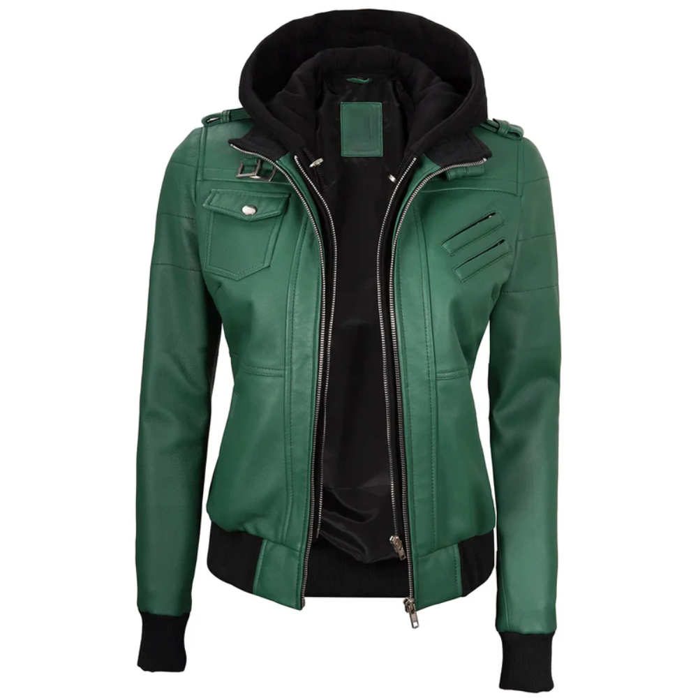 Women’s Emerald Green Faux Leather Hooded Bomber Moto Jacket