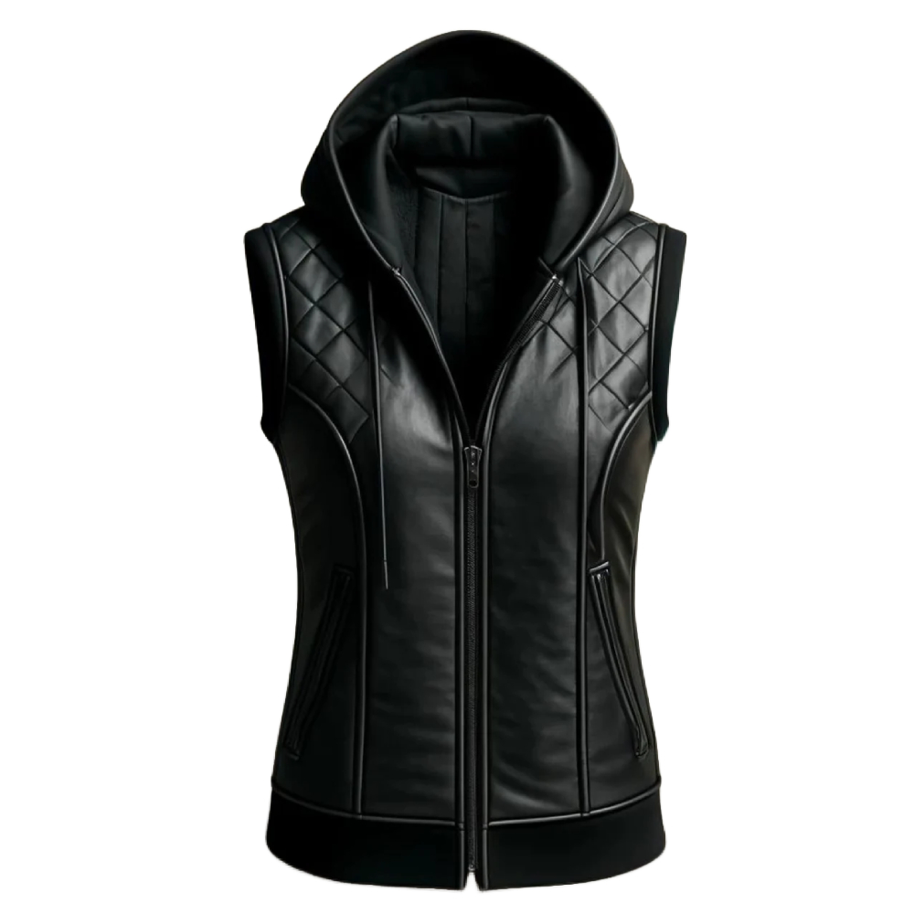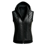 Women’s Fashion Stylish Black Quilted Vest Leather Hooded Jacket