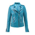Step into confidence with the Women’s Fashion Stylish Blue Slim Fit Biker Lambskin Leather Jacket – where bold meets beautiful!