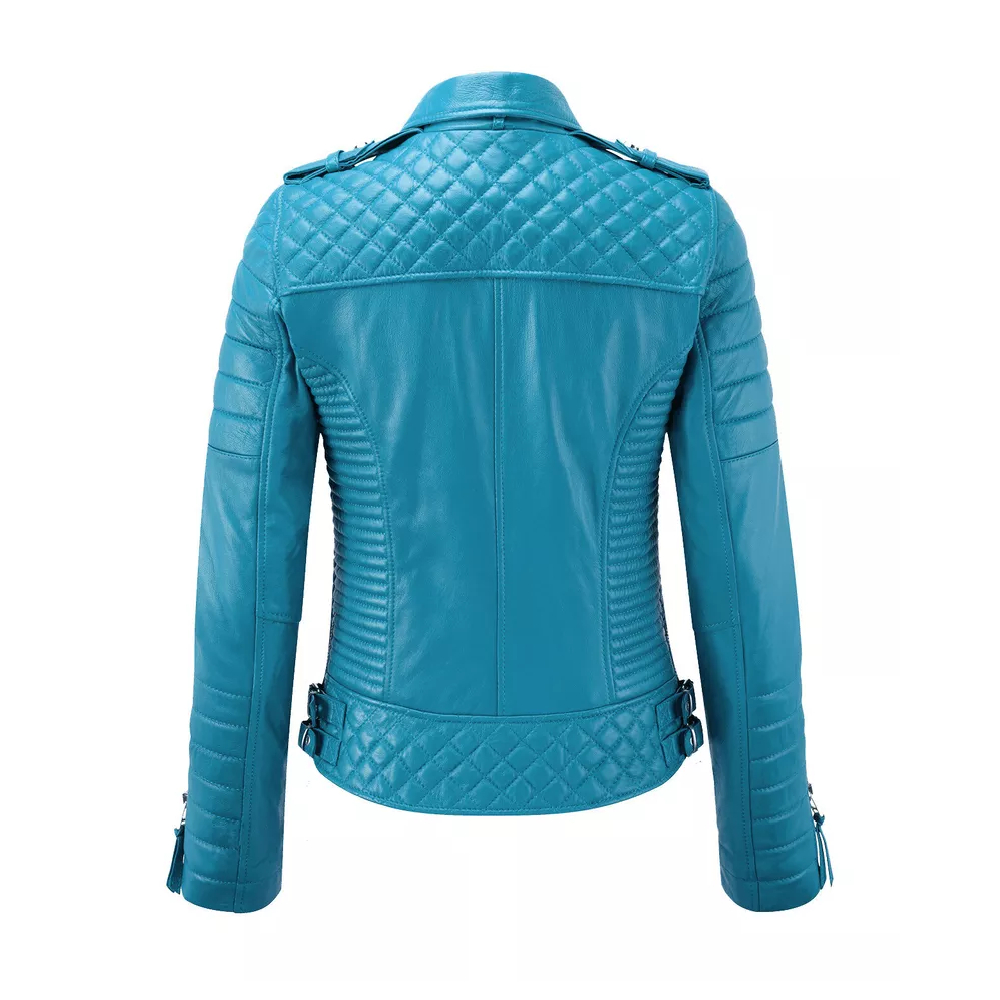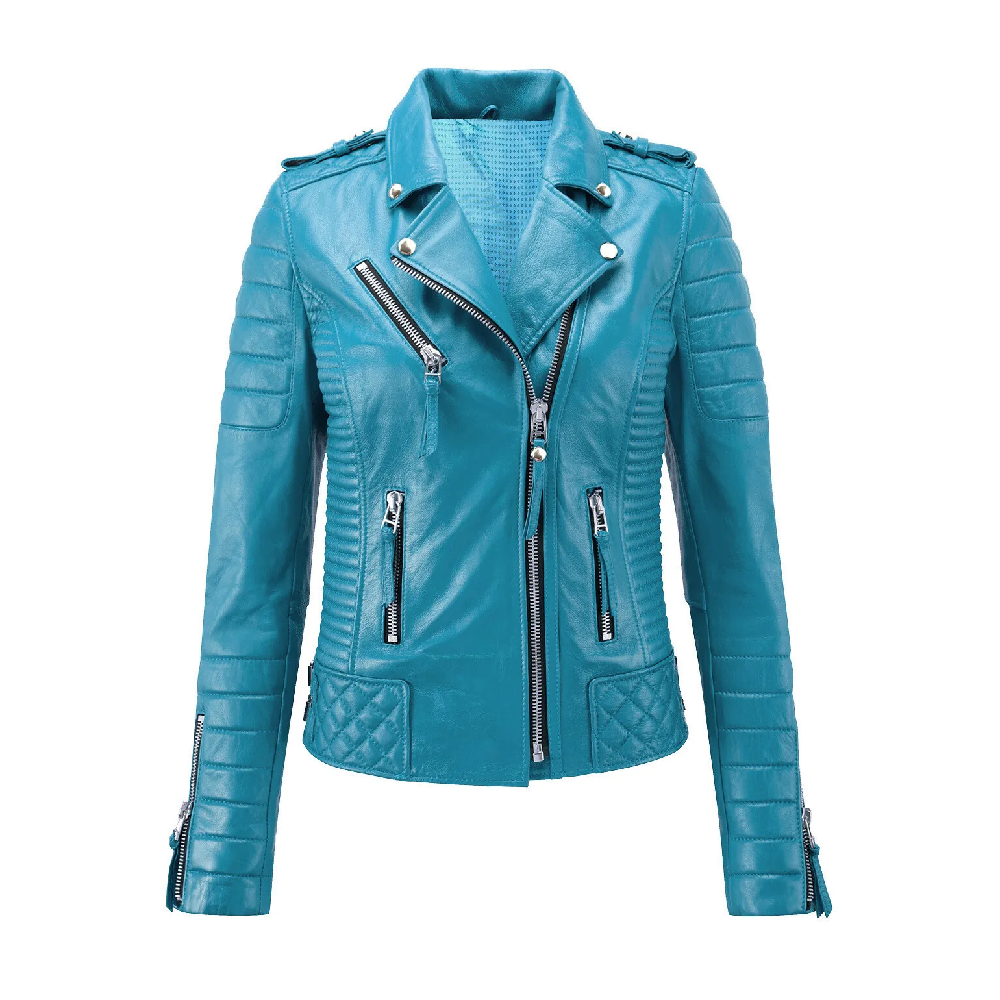 Women’s Fashion Stylish Blue Slim Fit Biker Lambskin Leather Jacket – Sleek & Sophisticated