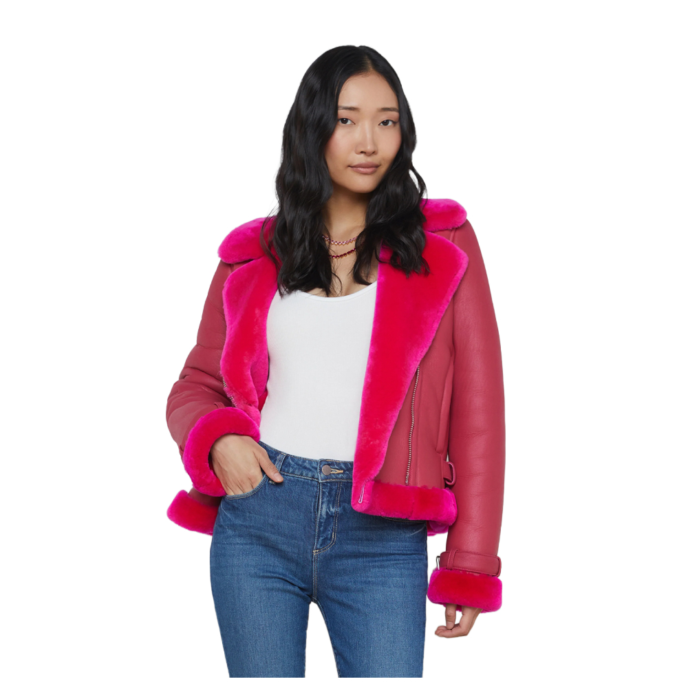 Make a bold yet elegant statement with this Niri Shearling Pink Leather Jacket – a perfect balance of warmth and fashion!