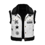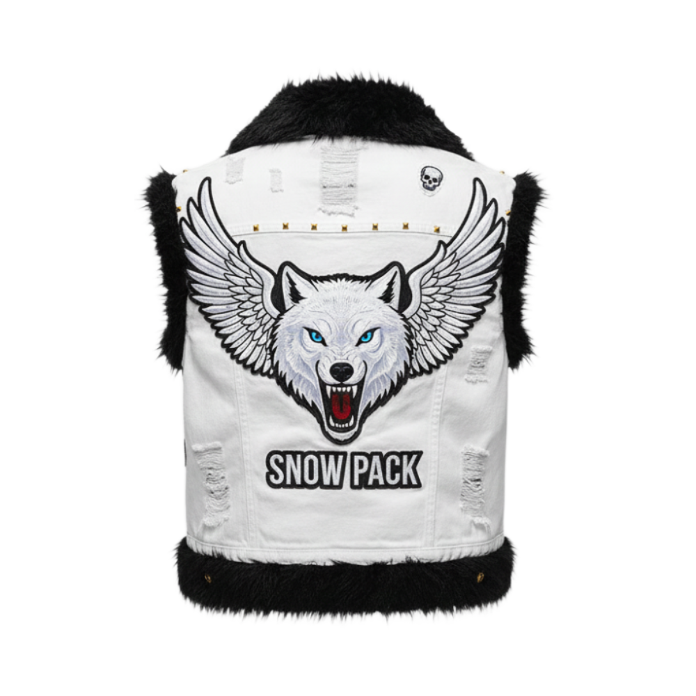 Unleash bold winter style with the Women’s Frost Wolf Black Faux Fur White Denim Vest Jacket. Crafted from premium white distressed denim, this statement vest is elevated with plush black faux fur trim and a striking frost wolf motif that symbolizes strength, independence, and untamed spirit.