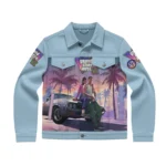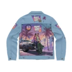 Channel the electric energy of Vice City with the Grand Theft Auto VI Pastel Light Blue Denim Jacket. Designed for women who love pop culture with attitude, this statement jacket features a soft pastel blue denim base accented with iconic palm tree and outlaw-inspired artwork. The relaxed denim silhouette blends retro coastal vibes with rebellious street style, making it the perfect layer for standing out while staying effortlessly cool. Light, versatile, and packed with personality, this jacket brings game-inspired fashion into real-world style.
